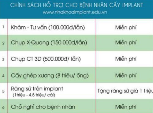 - Với chính sách hỗ trợ tối đa nhằm giúp bệnh nhân mất răng có được sức khỏe ăn nhai tốt, trung tâm hỗ trợ miễn phí cấy ghép xương cho bất kỳ trường hợp nào xương hàm không đủ điều kiện cây ghép implant truyền thống. Ngoài cấy ghép xương, bệnh nhân còn được miễn phí chụp CT 3D, miễn phí răng sứ sử dụng trên implant và nhiều sự hỗ trợ khác.